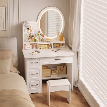 蔓斯菲尔(MSFE)多功能梳妆台卧室现代简约梳妆柜化妆台带妆镜一体式化妆桌卧室 LED灯镜【圆镜款+凳子】80cm 收藏 - 【圆镜款单桌】80cm